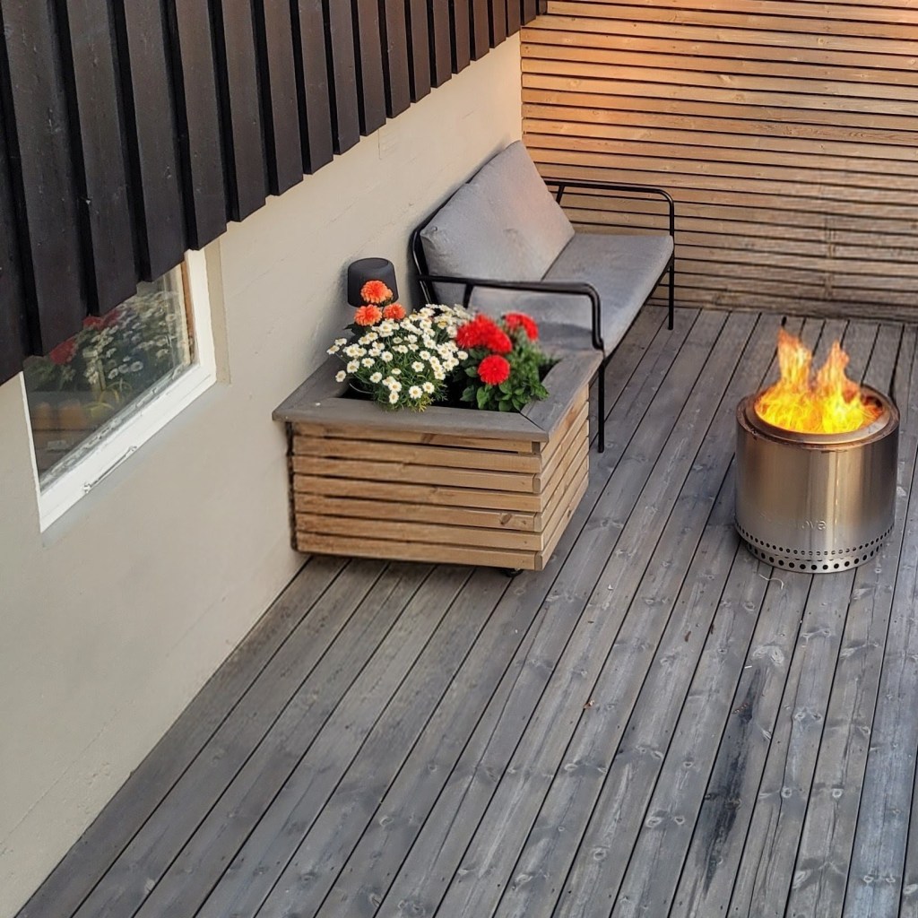 Selvvannende blomsterkasse på hjul. Dette er en kjekk blomsterkasse som kan brukes som områdedeler på terrassen, trilles enkelt rundt og har selvvannende blomsterpotte som står seg lenge uten vanning.